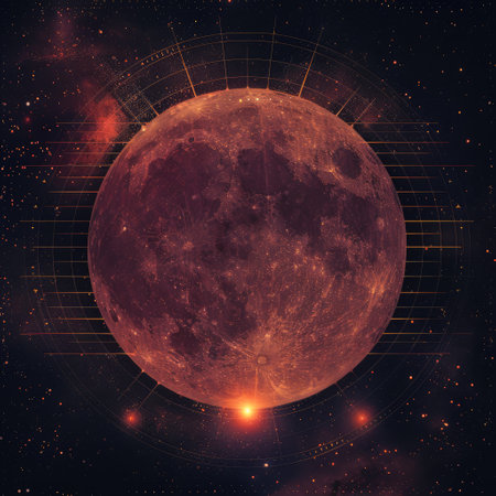 Blood red moon in night sky. Celestial prophecy. Lunar eclipse in dramatic red color with a cosmic sparkle. A symbol of transformation.