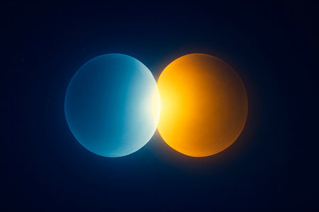 Two spheres dominate the scene, each radiating vibrant colors of pink and blue. The composition, set against a dark backdrop, creates a sense of depth and contrast. The use of light and color suggests a futuristic or conceptual theme, suitable for various design applications and potential editorial use.