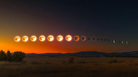 This captivating image showcases a beautiful sequence of a solar eclipse, highlighting the vibrant corona and unique celestial phenomena seen during this astronomical event.