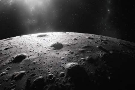 The lunar surface features numerous craters and rugged textures illuminated by distant sunlight in the blackness of space. This celestial view highlights the moon's geological history.