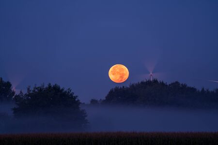 Landscape of a foggy morning in the woods with a full moon