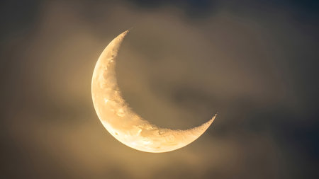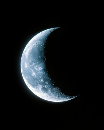 Witness the enchanting transition of the Moon, showcasing its delicate crescent shape illuminated against the dark expanse of the night sky.