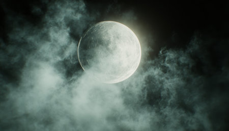 Mysterious Lunar Sphere Surrounded by Ethereal Fog and Soft Clouds Under a Full Moon s Glow
