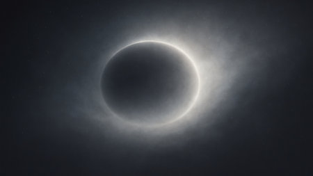 An atmospheric abstract background inspired by a solar eclipse, featuring a dark circular glow surrounded by soft radiant light. Ideal for dramatic designs, presentations, cinemati