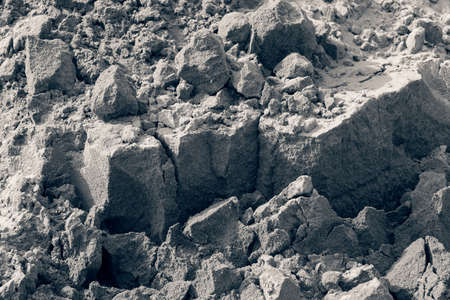 Close-up of ground with dirt and sand soil in random with small stones. Randomly sketched dirty loose coarse sand interspersed with debris and small gravel