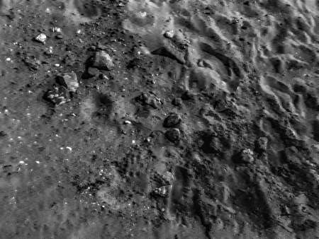 Detailed view of the moon's surface, showing numerous craters and textured terrain.