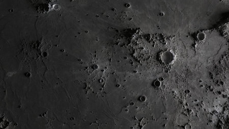 A detailed glimpse of lunar terrain highlighting rugged craters and textured plains, set against the vast darkness of space.