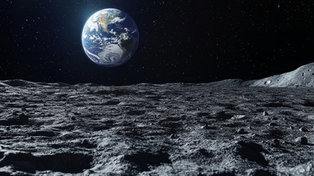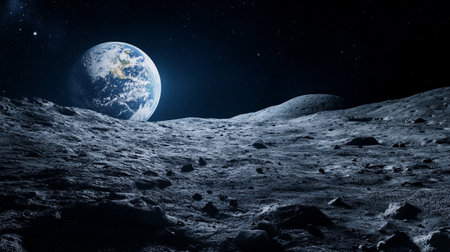 New space lunar mission. Landscape of the moon with stones and craters on the moon surface. Blue planet earth view from the moon. Moon, concept. Amazing Moon and Earth from space, creative idea