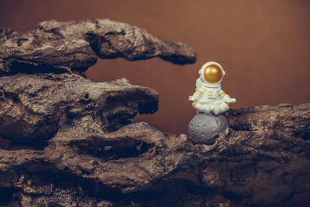 Astronaut wearing white space suit and helmet and meditating while sitting on the moon. Concept of cosmonautics, space travel, freedom, relaxing and peace of mind.