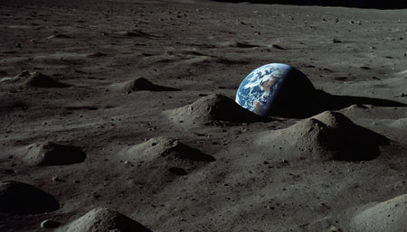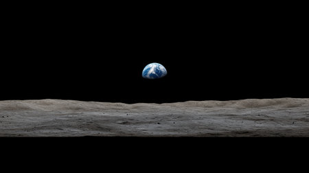 Earth photo taken from the moon, Earth rising from lunar surface on the horizon, blue World image from the moon surface, sunlight shines from the right corner.