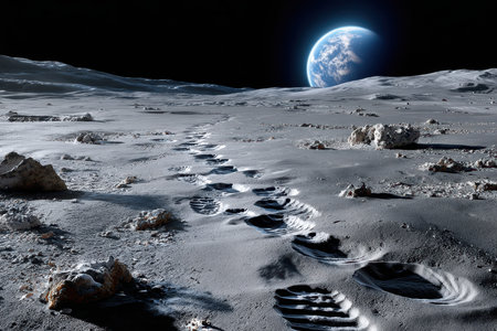 Lunar surface shows clear footprints leading towards Earth, highlighting the vastness of space.