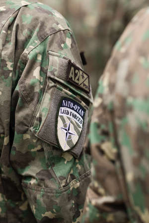 Bucharest, Romania - April 28, 2022: Shallow depth of field details with a Romanian soldier NATO armband (brassard, armlet).