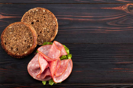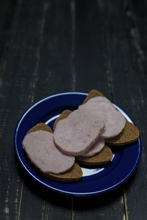 Few slices of bread, slices of boiled-smoked sausage in white plate on dark wooden table. Top view