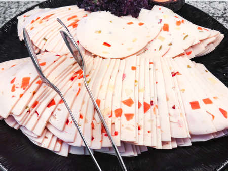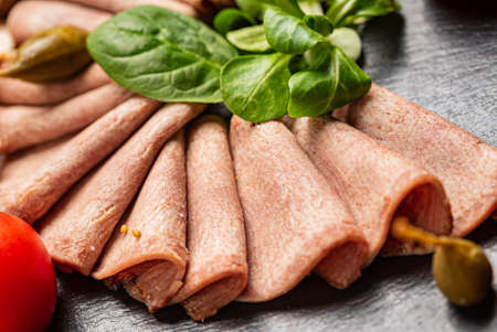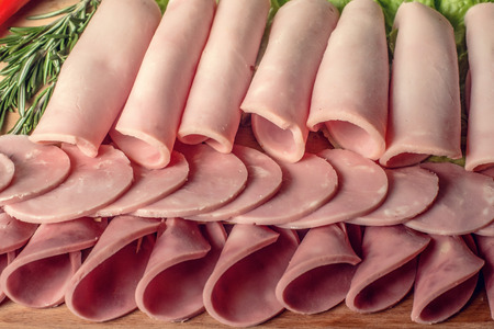 Appetizing thin slices of boiled pork ham, closeup view