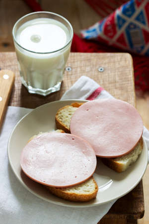 Sandwiches made of bread and boiled sausage, served with milk.