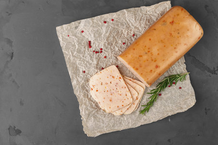 Delicious fresh ham cut into slices with salt, spices and herbs on a dark concrete background