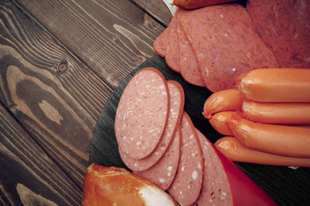 Assortment of different sausages laid out on brown wooden background