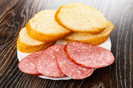 Slices of bread for toast and slices of sausage in white plate on dark wooden table