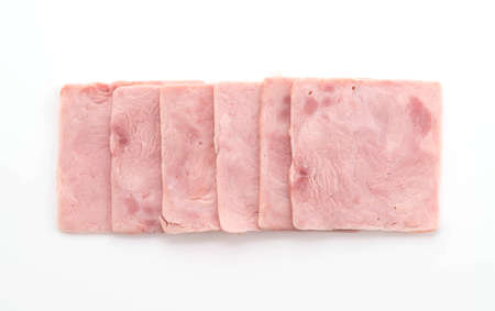 Sliced Pork ham. Fresh prosciutto. White background. Top view.