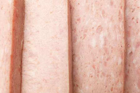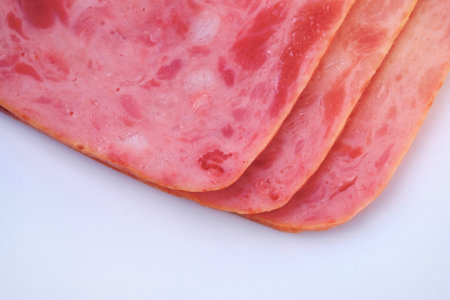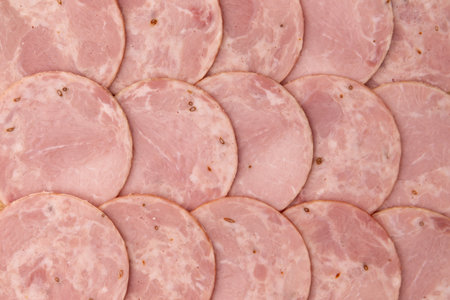 Spiced ham slices, canned meat for lunch sandwiches. Spiced ham as a food backdrop for your design.