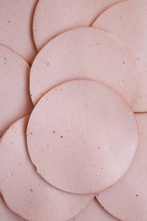 Sliced pork bolgna meat, top view. Flat lay, overhead, from above.