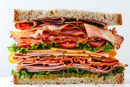 Sandwich with ham, cheese and vegetables on a white background.