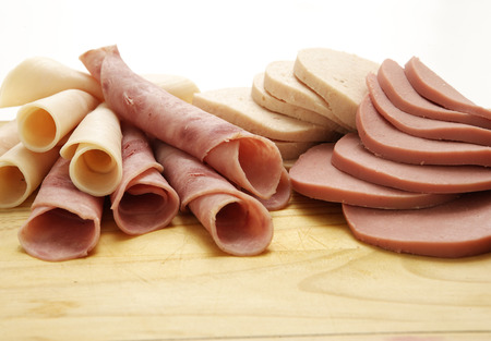 A collection of cold meats, bologna, and vienna sausages on a wooden board on an isolated white studio background