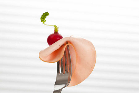 mortadella sausage on the fork, close up