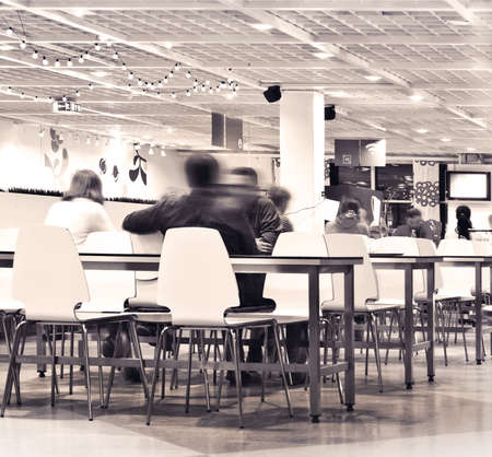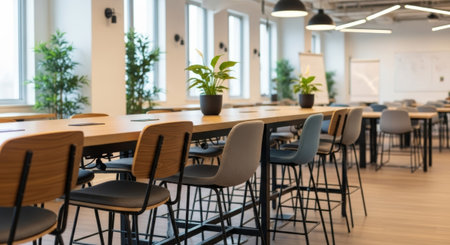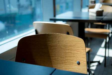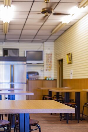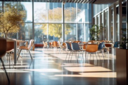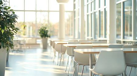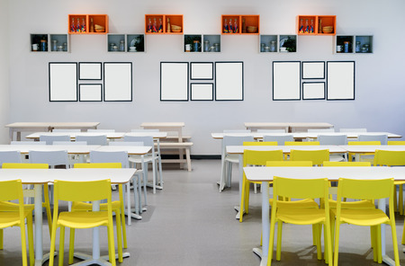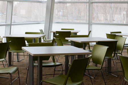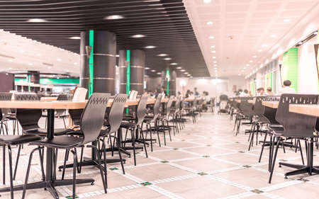Modern interior of cafeteria or canteen with chairs and tables, eating room in selective focus