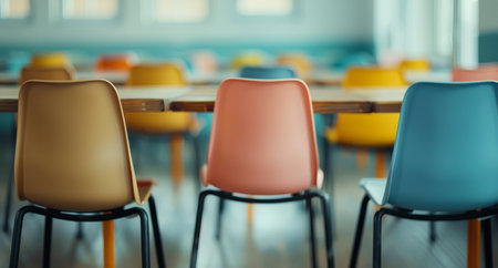 Empty rows of seats with tables and colorful chairs in the space of an educational institution or school.