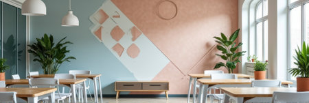 Modern cafe interior with geometric wall art and wooden furniture. That the image is generated using AI.