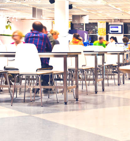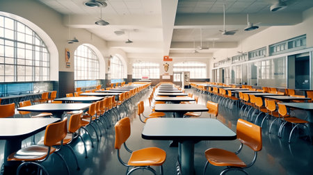 Interior background of a public cafeteria room with high school students and stainless steel tables and chairs