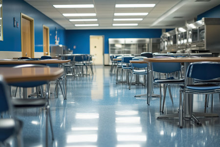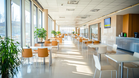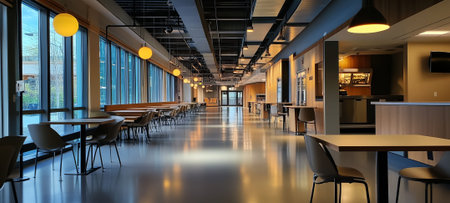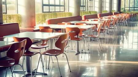 Practical cafeteria interior featuring durable and easy to clean surfaces for dining.