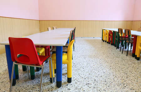 School kindergarden nursery dining room . children's furniture and toys in kindergarten . kindergarten class with the Green chairs and small tables