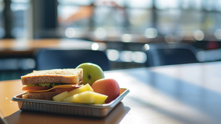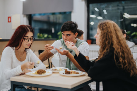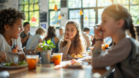 Students enjoying lunch together in a school cafeteria, engaging in vibrant conversation and building friendships in a relaxed and friendly environment. Capturing the essence of social interaction and daily school life.