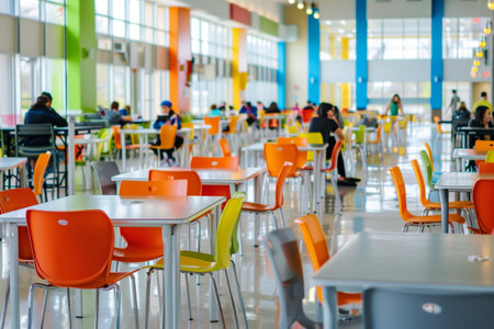 A large cafeteria filled with tables and chairs, bustling with activity and people, A bustling cafeteria filled with colorful chairs and tables