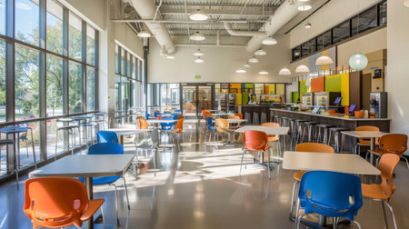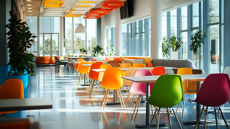Bright Modern Cafeteria With Colorful Chairs and Large Windows in a Daylight Setting