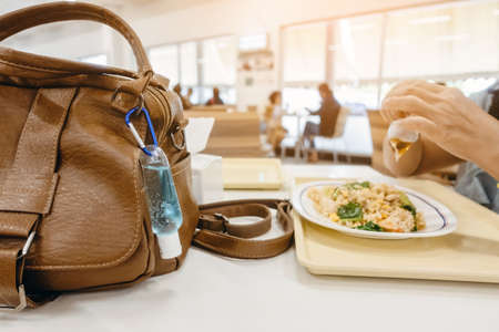 Mini alcohol gel bottle to kill Corona Virus(Covid-19) hang on a brown leather shoulder bag with hot coffee on table in cafe.New normal lifestyle.Health care concept.Selective focus on alcohol gel
