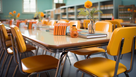 Classroom with orange chairs, books, notebooks and a vase of flowers