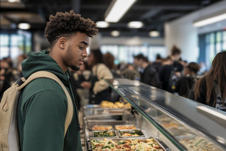 A bustling college cafeteria filled with students during lunchtime. The scene captures a diverse group of young adults in casual attire, many wearing backpacks, as they line up at a self-serve food counter. In the foreground, a young man in a dark green hoodie with a beige backpack carefully selects his meal, while a cafeteria worker behind the glass counter serves food. The counter is filled with a variety of freshly prepared dishes, including pasta, salads, and fried foods, all neatly arranged in trays. The background features a lively atmosphere with more students chatting, ordering food, and moving through the space, illuminated by warm overhead lighting. The modern interior design, with exposed ceiling elements and large windows allowing natural daylight to filter in, enhances the inviting ambiance. This image perfectly represents the dynamic energy of a university dining hall, student life, and communal eating spaces --chaos 10 --ar 3:2 --style raw --profile ja2nt66 --v 6.1 Job ID: 1bf232bb-cbf2-477c-83cc-3764f2e8b64d