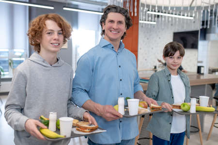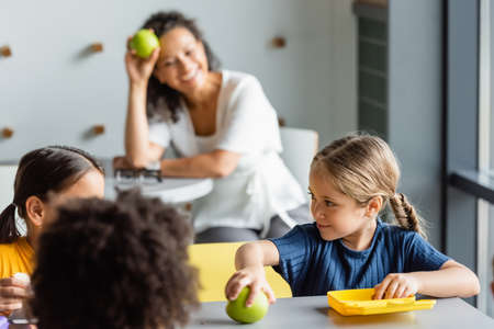 multiethnic kids having lunch in school canteen near teacher smiling on blurred background