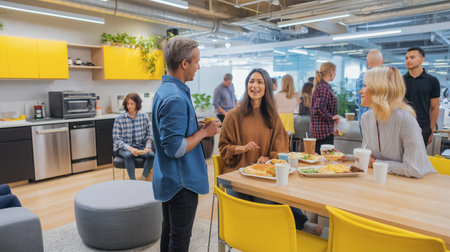 Casual office scene featuring coworkers chatting and enjoying snacks in a vibrant breakroom with yellow chairs and modern kitchen amenities, fostering workplace culture and team connection.