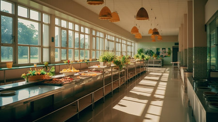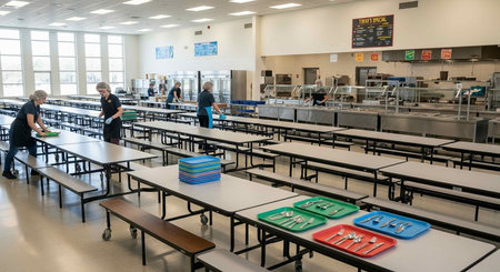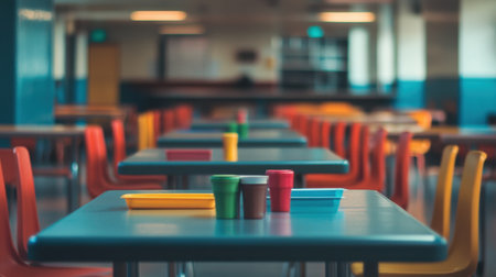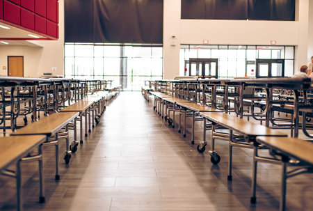 Empty school cafeteria with rows of tables, chairs pushed in, and colorful trays ready on the counter