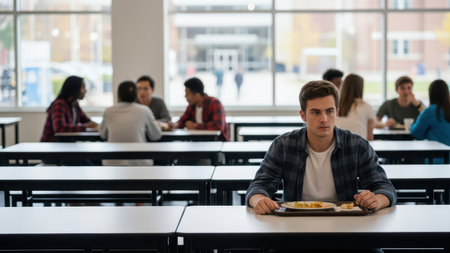 Young caucasian male sitting alone in school cafeteria with lunch tray.