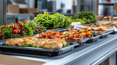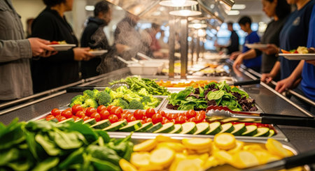 A vibrant buffet line showcases a wide array of fresh vegetables and healthy food options. People are seen serving themselves nutritious meals in a bustling cafeteria setting.