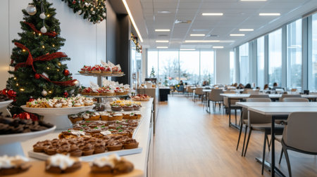 An office break room with Christmas treats and decorations, creating a festive atmosphere for employees
