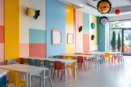 A bright and modern restaurant interior featuring colorful chairs and tables. This vibrant space is perfect for casual dining and social gatherings.