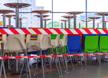 Multi-colored plastic chairs and tables in cafe closed by a protective tape.