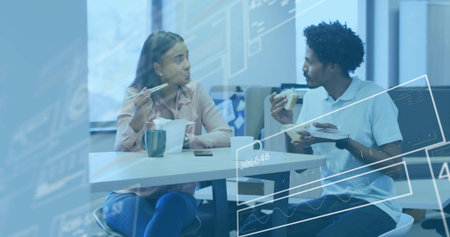 Talking coworkers using chopsticks and eating sandwich at office lunch table, with mug smartphone. Professionalism, collaboration, communication, urban, modern, casual, productivity