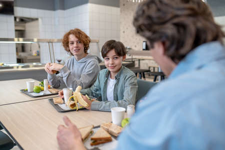 Cheerful happy cute students funny kids eat in school cafeteria, dining room, canteen, childhood boy and girl education fruits and vegetables